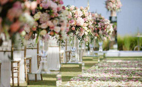 Nền trắng kết hợp cùng với các phụ kiện màu hồng tạo sự nổi bật cho phong cách tiệc cưới lãng mạn. Những buổi tiệc ngoài trời với không gian và ánh sáng mở trong một khu vườn cỏ xanh, hoa khoe sắc thắm, cạnh bên bãi biển xanh biếc hay trong khuôn viên một khách sạn xung quanh hồ bơi,…tất cả đều là những địa điểm hoàn hảo cho sự lãng mạn được bay bổng.